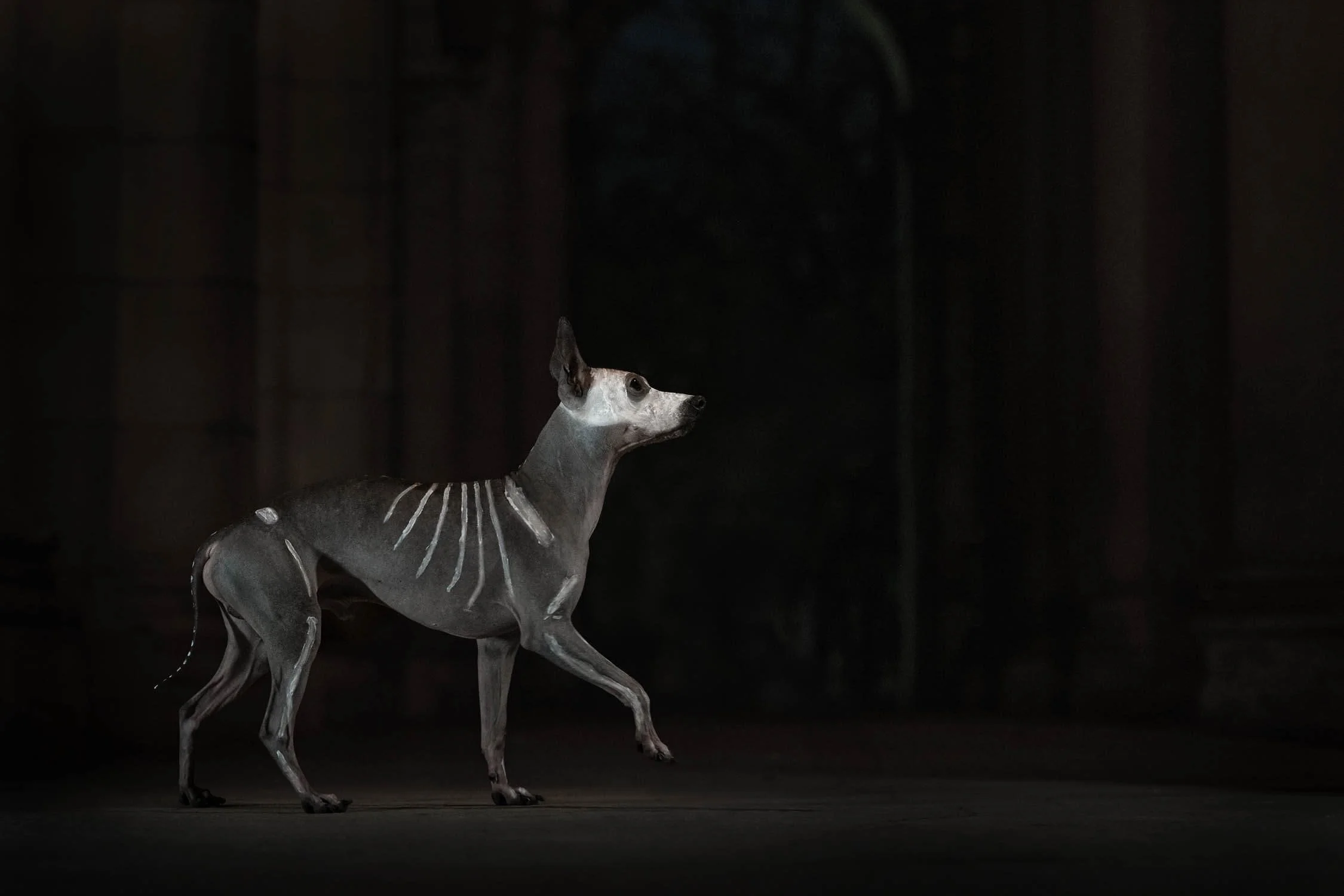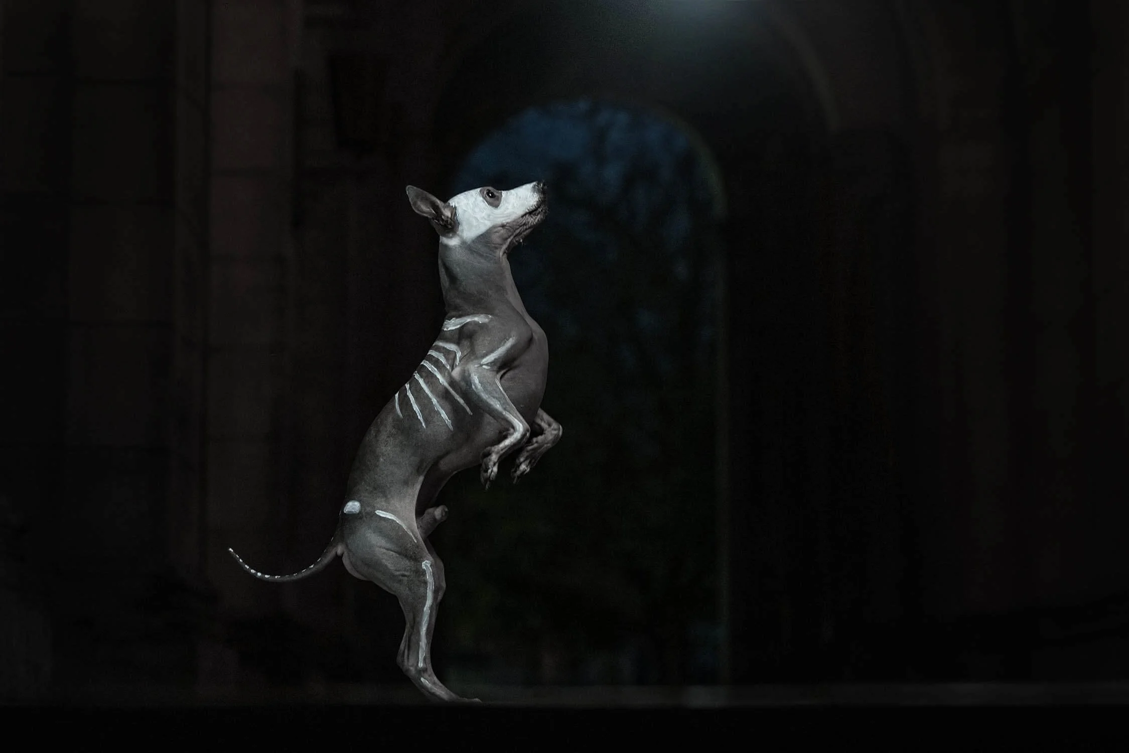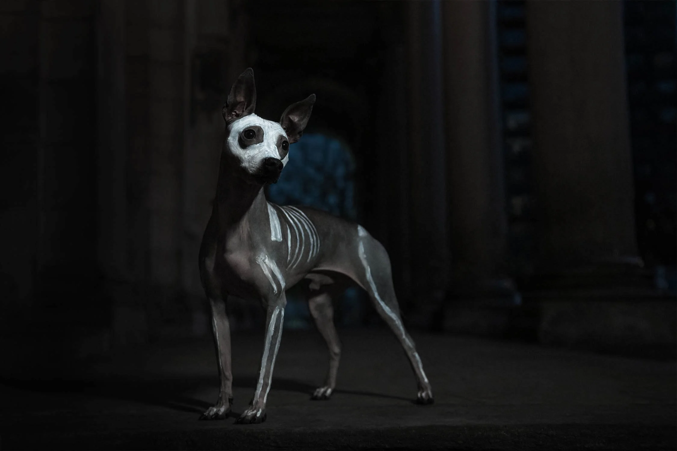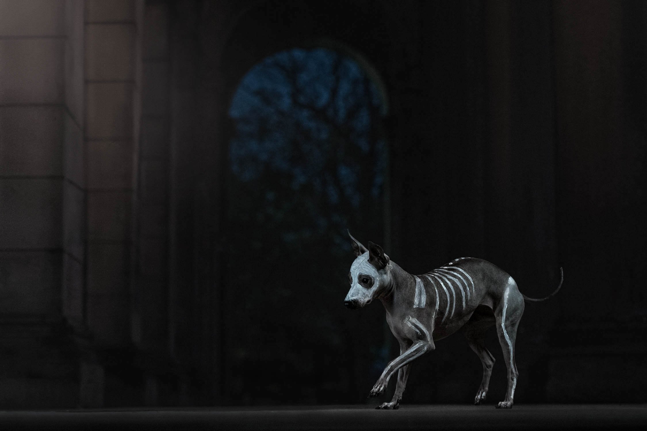 Pour pousser l’expérience encore plus loin, la séance photo s’est déroulée de nuit, dans une église spectaculaire de Montréal. L’éclairage se devait d’être dramatique pour donner aux photos une ambiance digne d’un film mystérieux et de faire ressortir la peinture blanche du squelette..